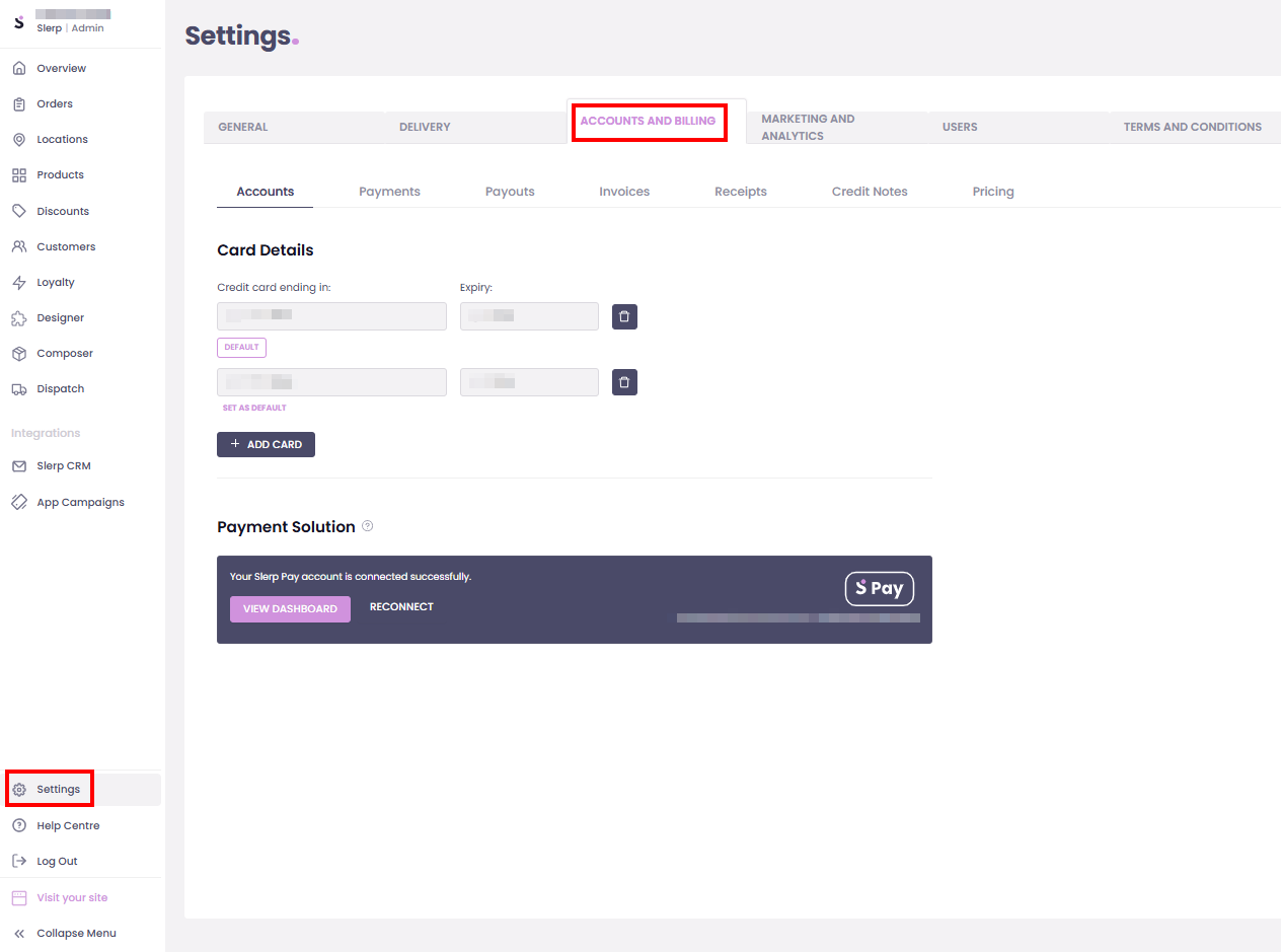 The Accounts and Billing tab is where you manage all things financial in Slerp