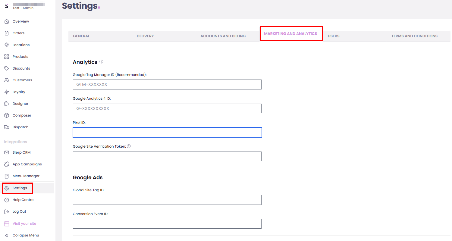 The Marketing & Analytics tab is where you connect your Slerp store to your tracking, advertising, and review tools.