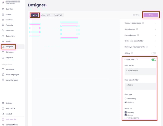 Login to Controls → Designer → Web → Shop tab → toggle Custom Field