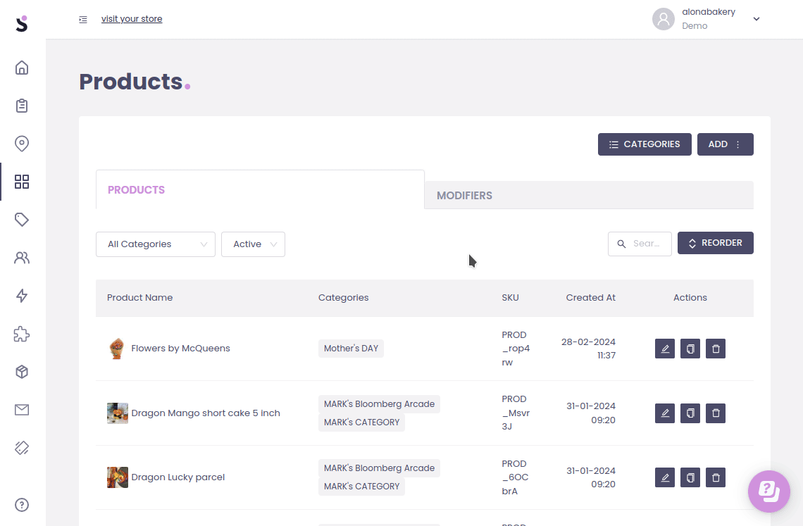 Use products to build your online menu. Each product sits in a category, has a price, optional image, and key attributes like allergens and calories.