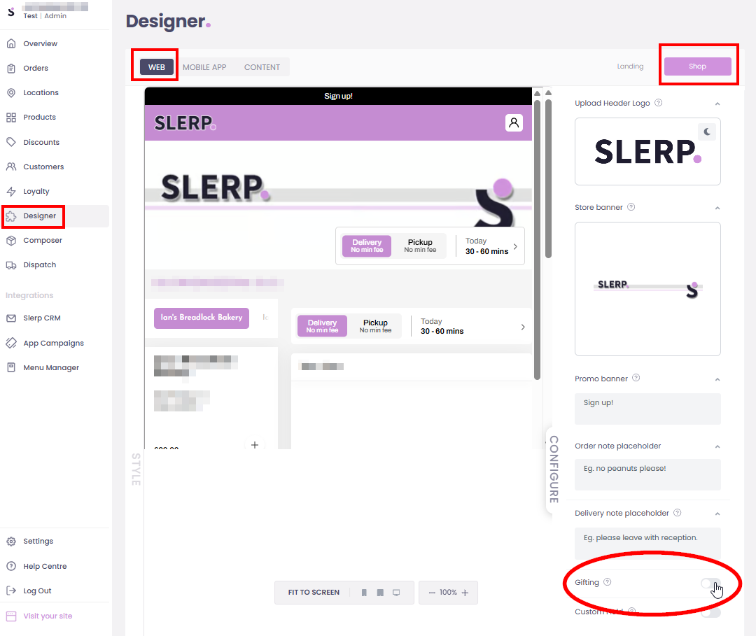 Login to Controls Dashboard → Designer → Web → Shop tab