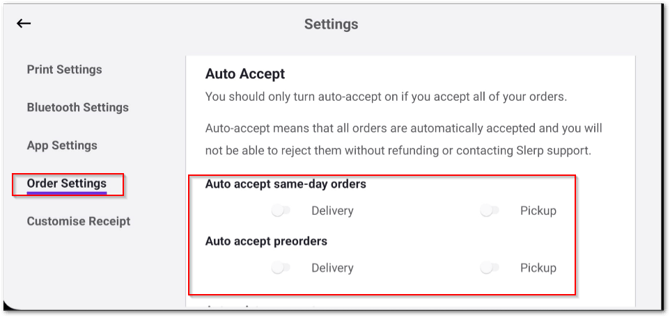 You can Auto-accept and Auto-print orders. This will speed up the operational process and allow more flexibility in order creation as the staff will not need to constantly monitor the tablet.