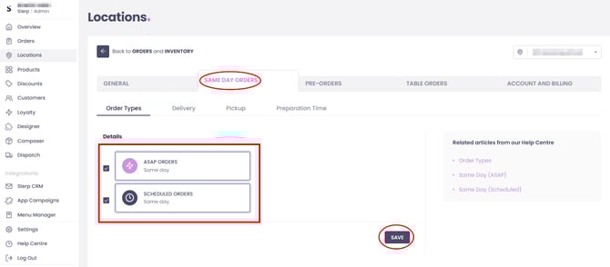 3. Go to Same Day Orders tab, then Order Types, tick ASAP ORDERS and/or Scheduled Orders then save.