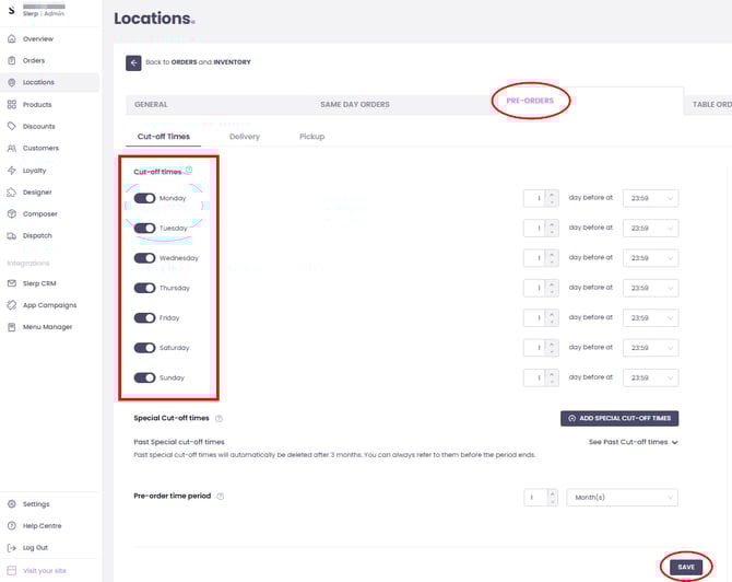 3. Go to Pre-Orders tab, then set Cut-off times then save.
