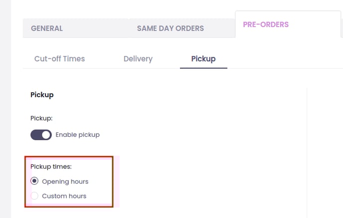 You can toggle on each day (Mon-Sun) to allow customers to place pre-order Click & Collect orders