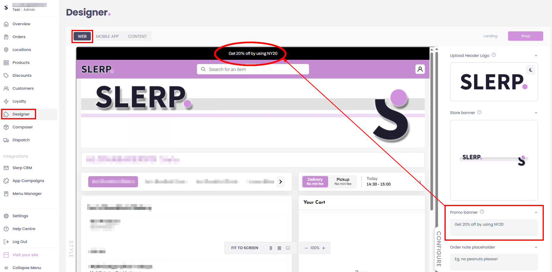 Login to Controls → Designer → Web → Shop tab → Promo Banner