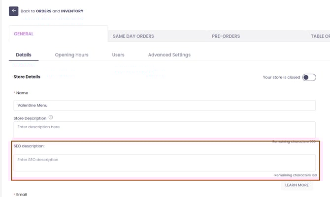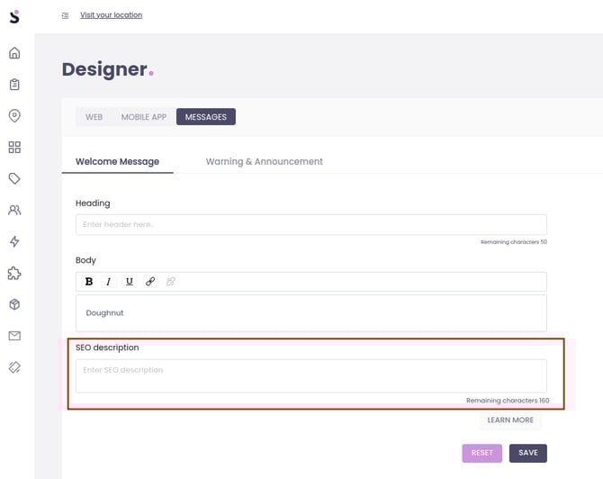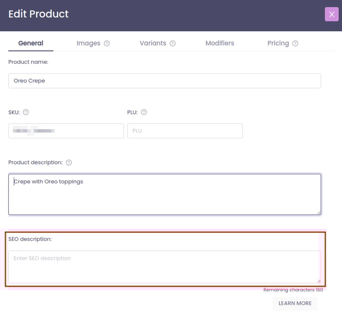 Slerp provides SEO fields across different areas of your Slerp Space to help improve how your site appears in search engine results. These fields allow you to add meta descriptions and related SEO content to key pages.