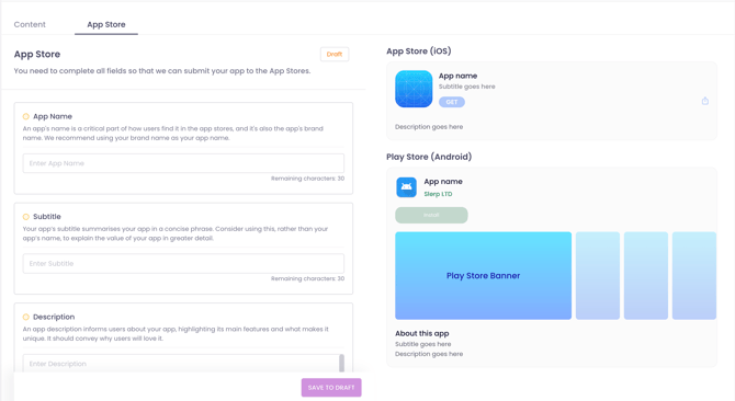 To complete your submission, you will need to fill in all of the fields below in Controls. As you do so, you will be able to see a preview of how your app listing will look on both stores. This is not an exact representation of either platform, but will give you a realistic idea of how your app will appear to customers before you submit.