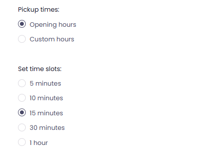 30 minutes, 1 hour, or fixed time range for delivery. You may also choose to set custom hours, if you don't want the pre-orders to be coming during your regular opening hours. Pickup/Click&Collect has more time slots.