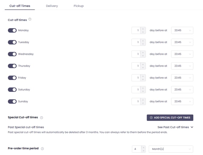 When enabled, you can customise the inventory, time-slots, and cut‑off so that customers only see the products, dates, and times you can realistically fulfill when they order in advance.